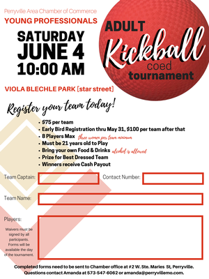 Perryville Area Chamber of Commerce Young Professional Ambassadors are hosting an Adult Kickball Tournament, Saturday, June 4 starting at 10:00 a.m. at Viola Blechle Park.